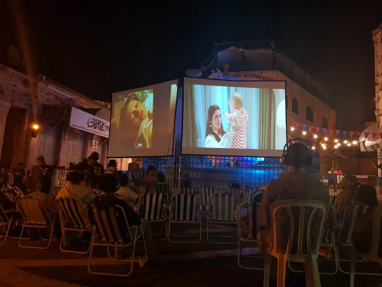 An experimental 3 nights event in the old city of Jerusalem. Each night, two movies were screened side by side, simultaneously. Sound was provided by headphones with a nob to switch between the movies.